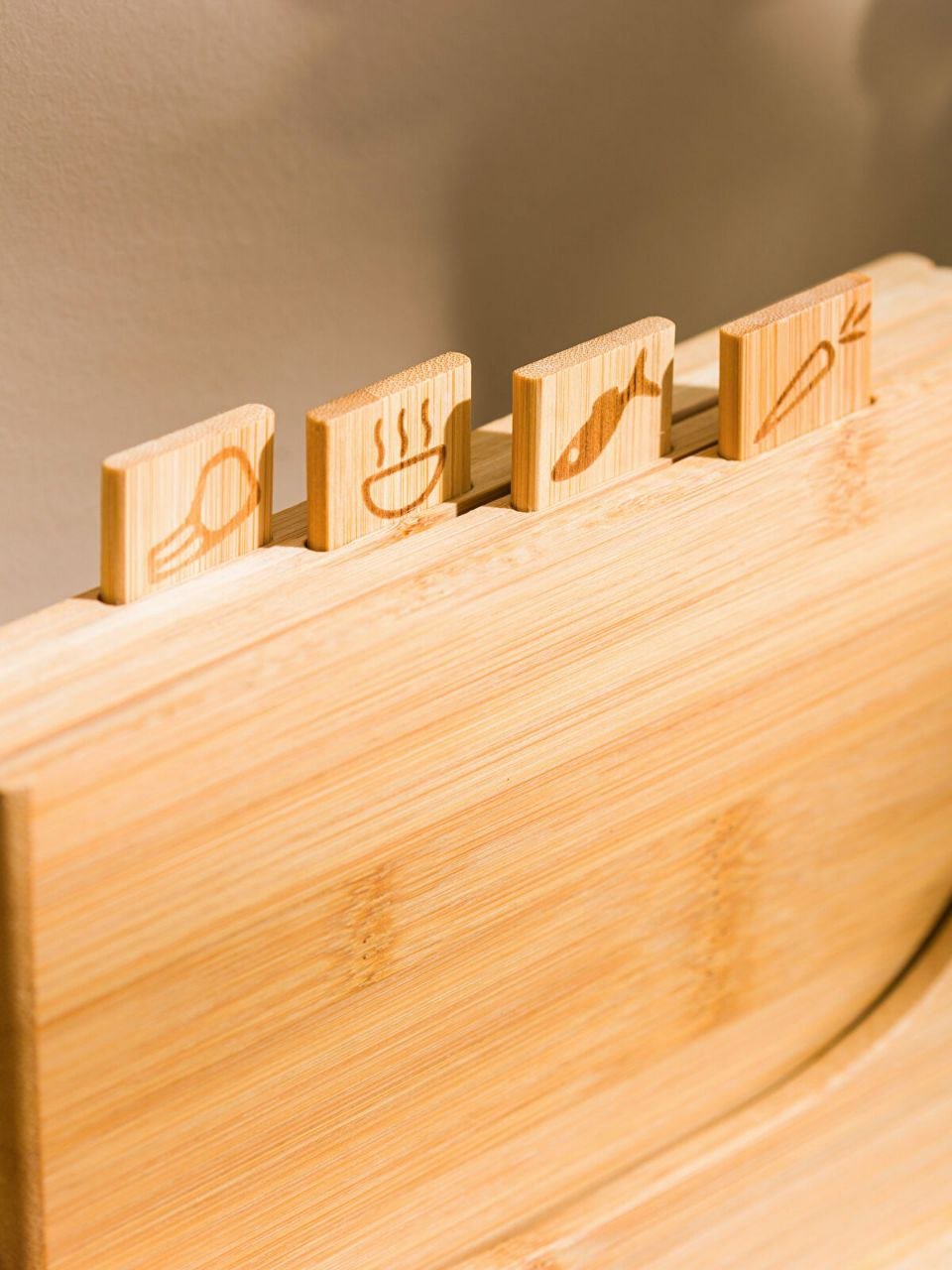 تتكون المجموعة عادةً من 4 ألواح تقطيع مختلفة. مصنوعة من الخشب، وهو مادة مستدامة وأكثر متانة من أنواع الخشب الأخرى. يساعد وجود ألواح منفصلة على منع اختلاط نكهات وروائح الأطعمة المختلفة (مثل الخضار واللحوم والأسماك). تأتي مع حامل لسهولة التخزين والتنظيم.